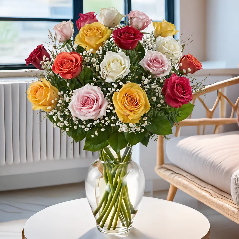 Astonish her with this stunning arrangement of 24 mixed roses, beautifully arranged with fresh fillers in a clear glass vase. Each charming rose will surely make her smile and fill her heart with happiness, making this bouquet a perfect gift for any occasion.
