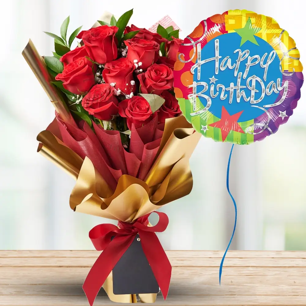 Celebrate their special day with this stunning bouquet of 15 red roses, elegantly accented with baby’s breath and fresh green fillers, wrapped in a beautiful combination of red and brown paper. Paired with a festive "Happy Birthday" foil balloon, this arrangement is the perfect way to express love, joy, and warm birthday wishes.
