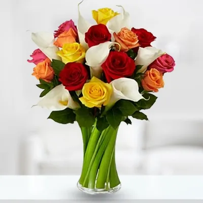 This exquisite bouquet features 12 mixed roses and 6 elegant white calla lilies, arranged beautifully in a clear glass vase. The combination of vibrant mixed roses and the timeless beauty of white lilies creates a stunning display that’s perfect for expressing love, admiration, and appreciation. Whether it’s for a birthday, anniversary, or any special occasion, this bouquet is sure to make a memorable gift.